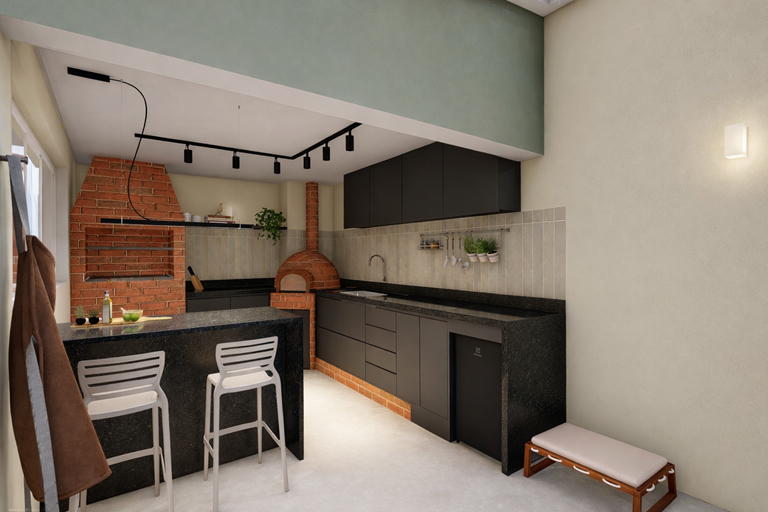 O forro em cimento queimado contribui para reforçar o caráter contemporâneo da proposta, adicionando uma camada de materialidade bruta que contrasta de forma equilibrada com os demais elementos do espaço.
