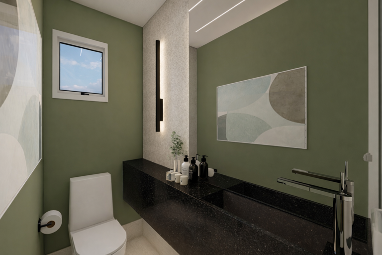 A proposta concentra-se em valorizar o que já existia, introduzindo elementos que reforçam identidade e continuidade entre os ambientes. Um dos gestos mais marcantes é o uso do verde na parede da escada, criando um eixo visual que conecta o hall de entrada à sala íntima e introduz profundidade ao percurso interno.