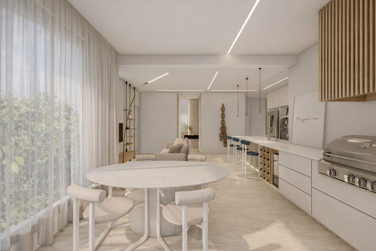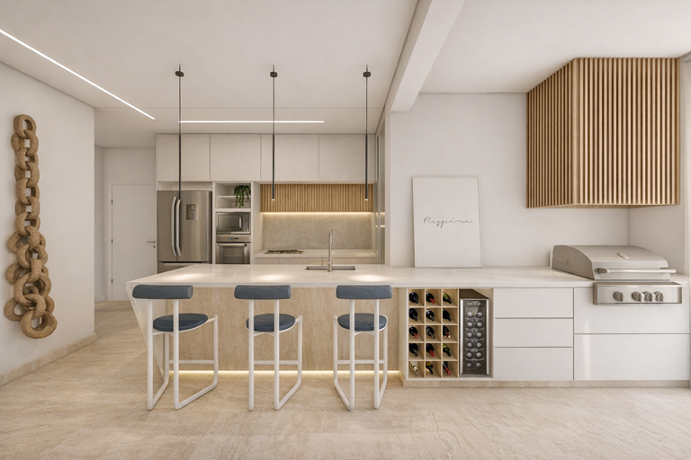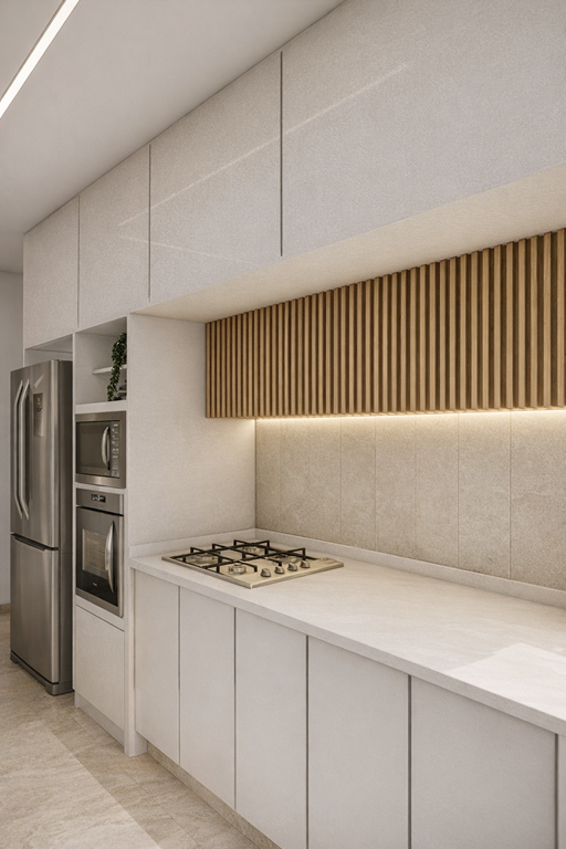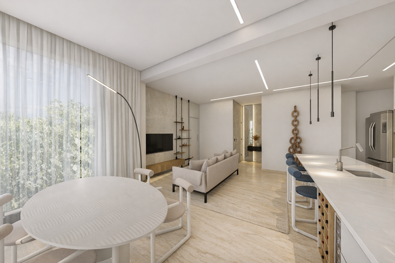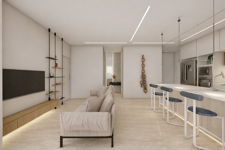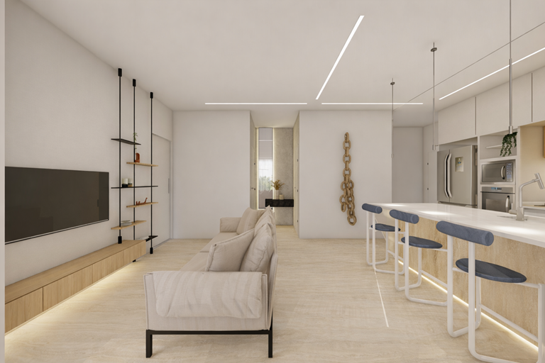 Este apartamento foi concebido a partir de uma linguagem que valoriza elegância, minimalismo e equilíbrio visual. No living, a composição se constrói através da combinação atemporal entre tons neutros, branco e madeira, criando uma atmosfera leve, acolhedora e sofisticada.