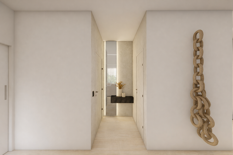 Um interior que traduz elegância minimalista através da harmonia entre tons neutros, madeira e uma composição serena de espaços.