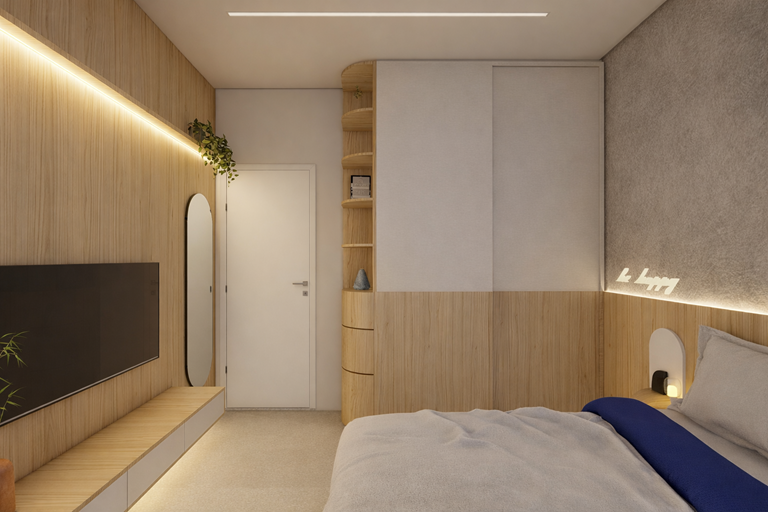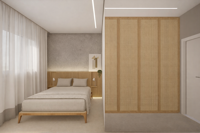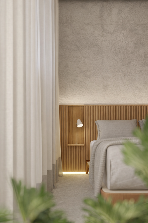 A materialidade natural da madeira introduz calor ao ambiente, enquanto o branco e os tons suaves ampliam a sensação de luminosidade e amplitude. O resultado é um espaço sereno, onde cada elemento foi cuidadosamente escolhido para contribuir com a harmonia do conjunto.