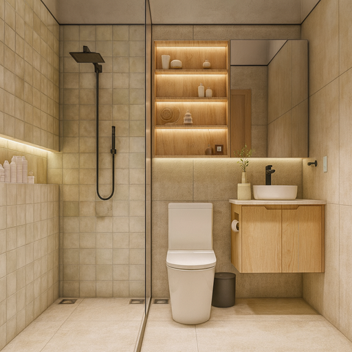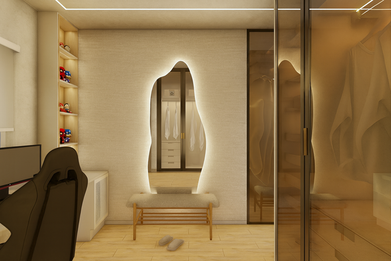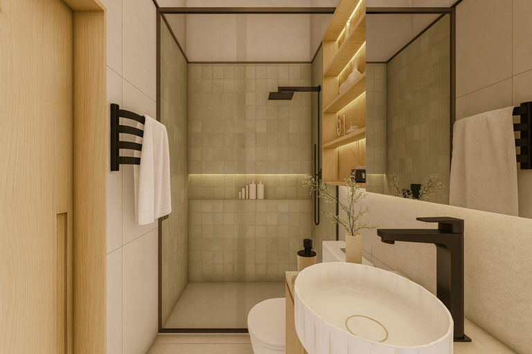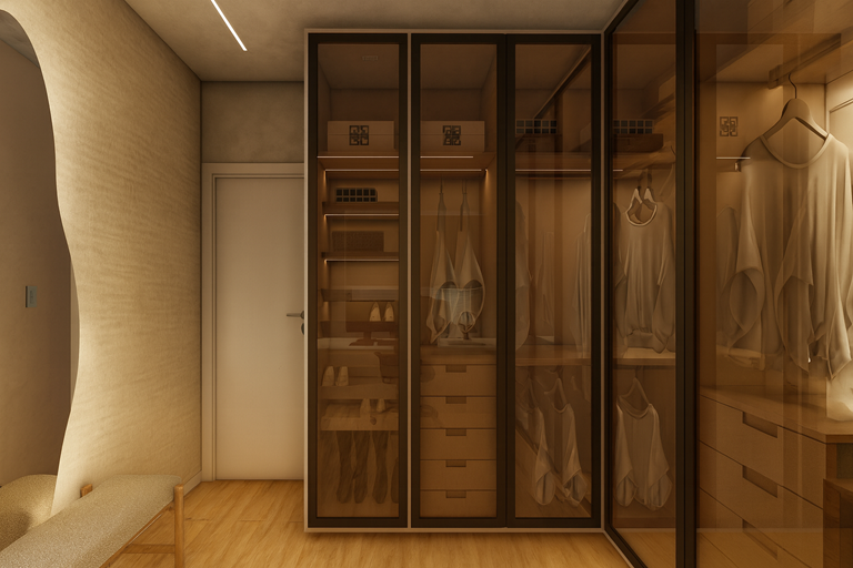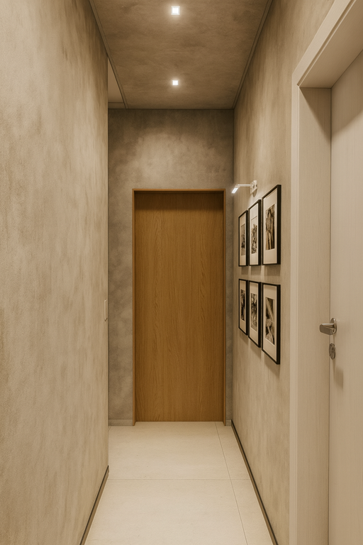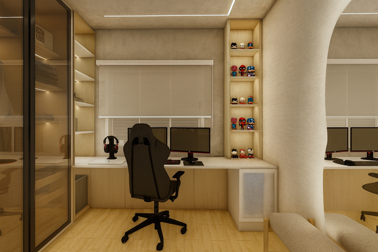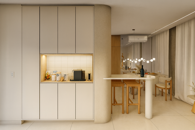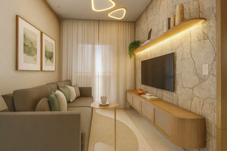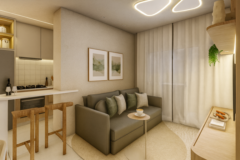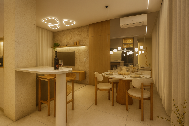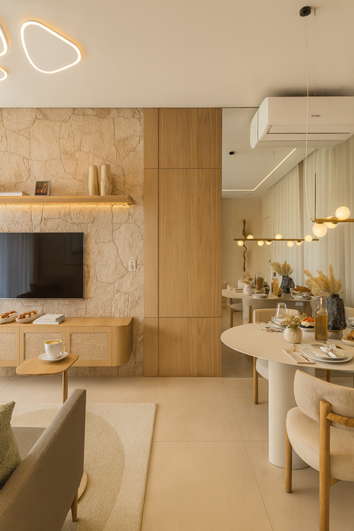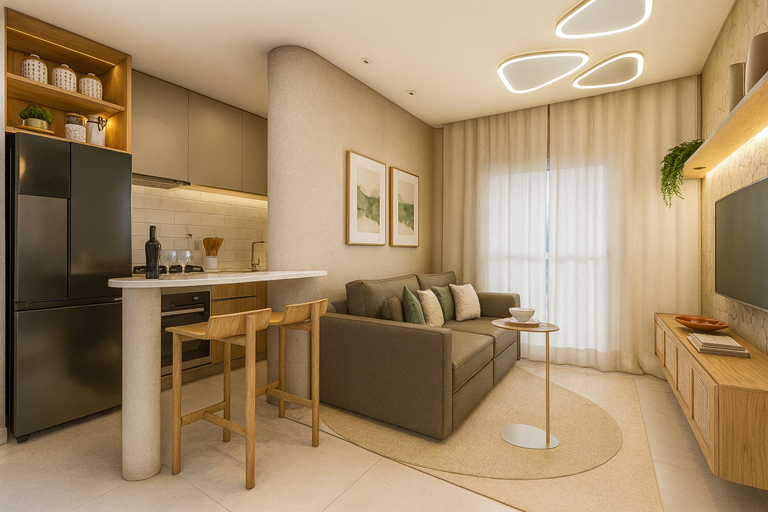 Um interior compacto onde materiais naturais, formas orgânicas e luz quente constroem uma atmosfera contemporânea e acolhedora.