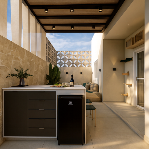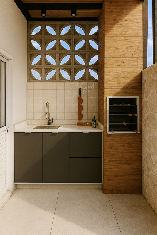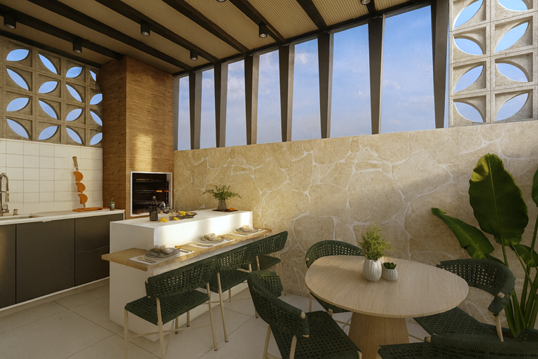 A materialidade desempenha papel central na construção da identidade do projeto. A presença da pedra moledo, da madeira e da telinha indiana introduz textura e naturalidade aos espaços, reforçando a sensação de conexão com elementos naturais e trazendo equilíbrio visual à composição.